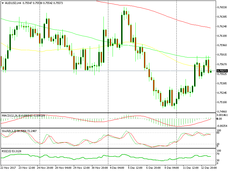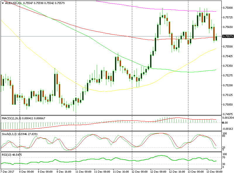 We moved the SL to 0.7581 yesterday and it has proved to be a great decision so far. The price approached the SL yesterday, but the 200 SMA (purple) on the hourly forex chart held its ground pretty well.