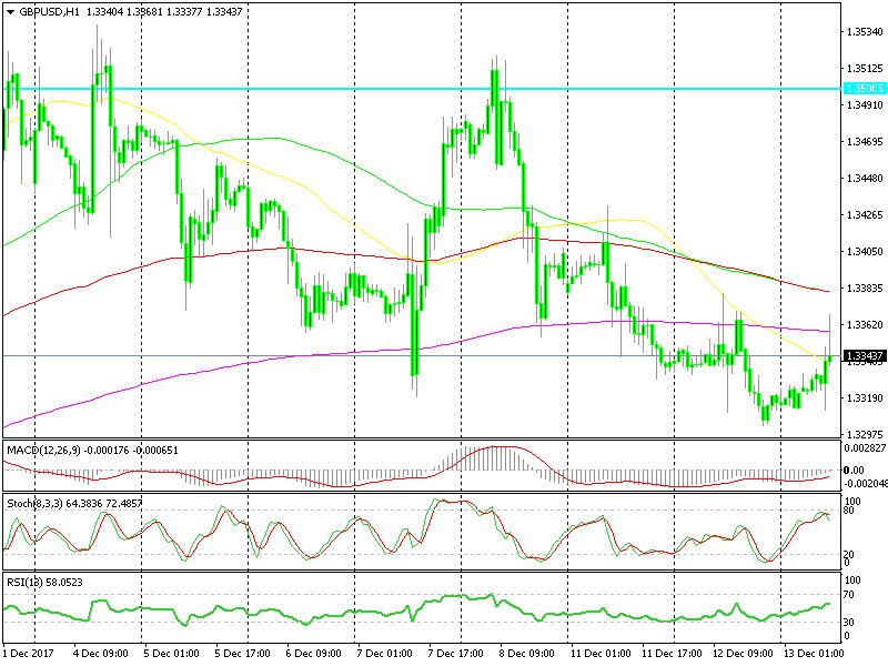 It wasn’t a straightforward jump to be honest. The price dipped to around 1.33 for a few minutes before reversing and shooting higher. This sort of price action tells us that the nerves are playing games right now.
