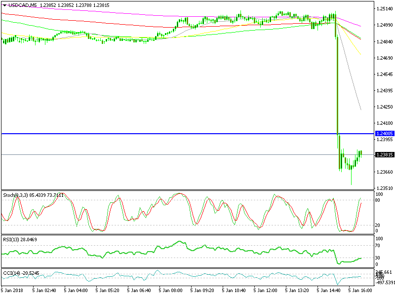 The main reason for the dive in USD/CAD was the Canadian employment report. New jobs increased by around 80k , although expectations were for a 2k increase. The unemployment rate was expected to increase from 5.9% to 6%, and declined in the end to 5.7%.