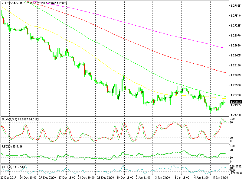 Another opportunity is now presenting itself. The USD/CAD has been retracing during the European morning hours, and it is facing a couple of moving averages on the top side. As it can be seen on the chart above, the 50 SMA (yellow) and the 100 SMA (green) have been providing resistance on top. Every time the price has touched one of them, the pullback has ended and the USD/CAD has reversed back lower. Now, the price is close to those two moving averages, and it seems like the buyers are having second thoughts already.