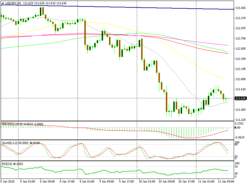 This morning, USD/JPY looked like it was retracing higher, however, it stopped below the 50 SMA (yellow). The hourly candlesticks formed a doji and a hammer near the top, both of which are reversing signals.