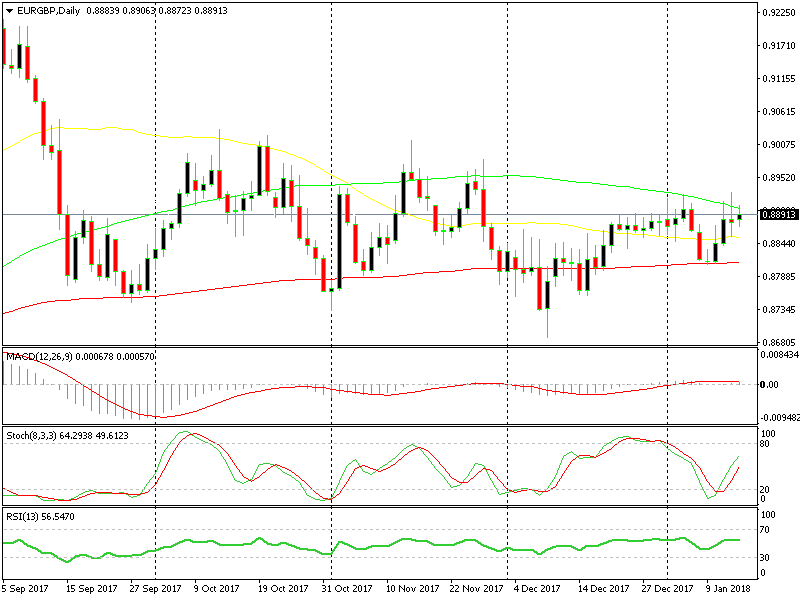 EUR/GBP made quite a reversal last week, reversing higher right at the 100 smooth MA (red) after the daily chart had formed a pin candlestick. At that time, the stochastic indicator was also oversold. The reverse occurred midweek, and by Friday, the pair had climbed more than 100 pips.