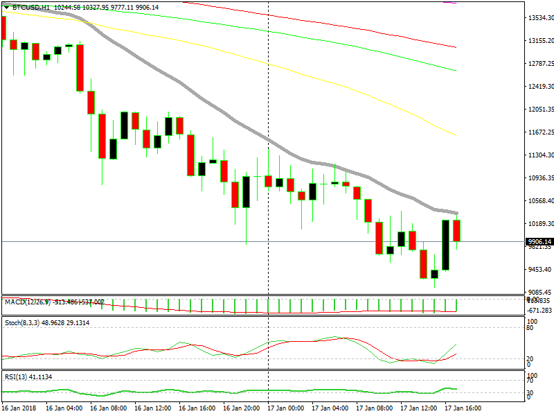 Bitcoin and other cryptocurrencies jumped up after that. Bitcoin popped above $10,000, but has now slipped below again. The same story is on all major altcoins. They make a quick jump higher which looks like a reverse, only to resume the downtrend in no time and extend further.