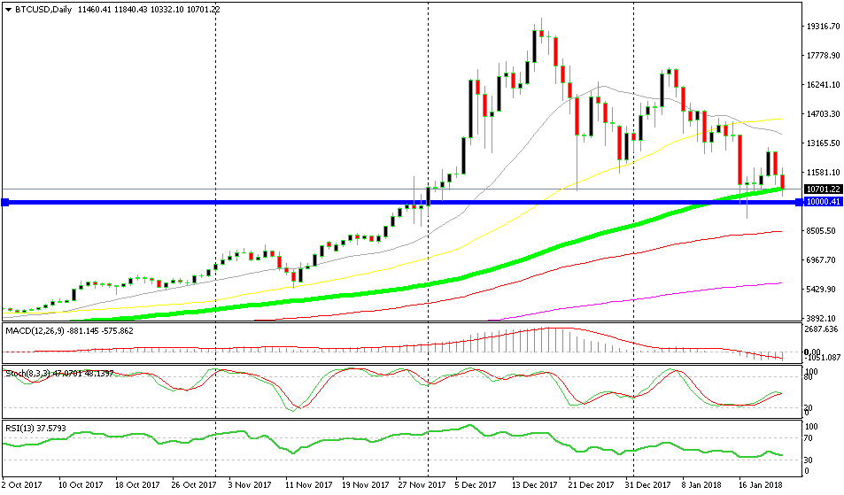 A while ago we highlighted the 100 daily SMA (green) on Bitcoin. Thie moving average has been providing support for this cryptocurrency last week, and it is standing above the big round $10,000.