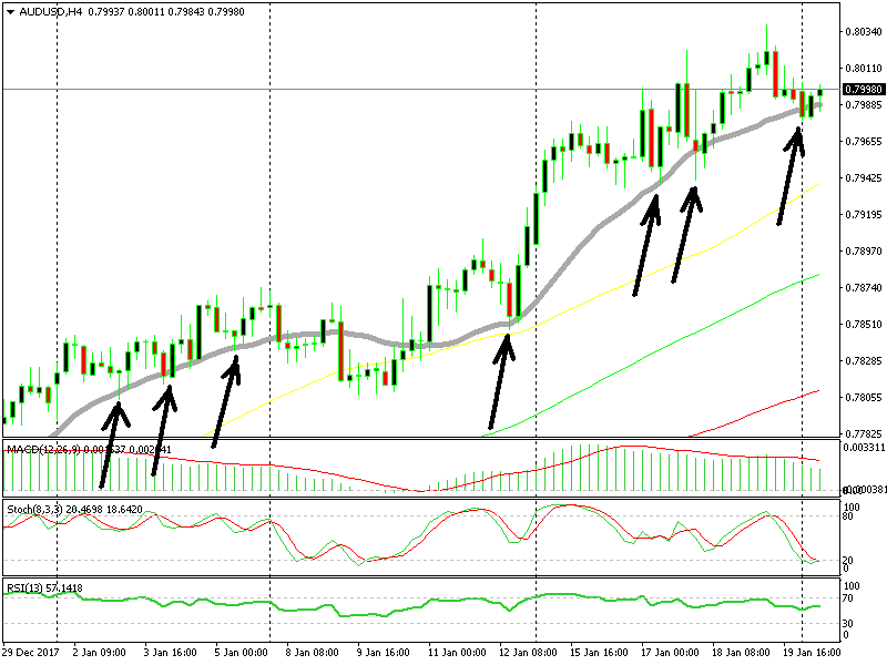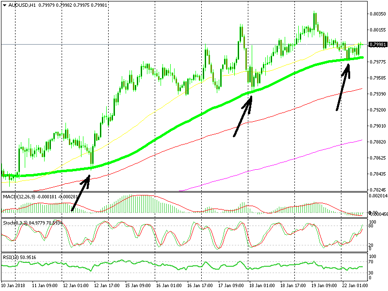 Currently, we have a live forex signal on AUD/USD, opened last week. The pair has been following a steady uptrend since early December, when the US Dollar began the downtrend and moving averages have helped.