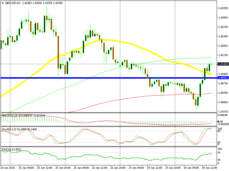The markets have been quite difficult to read and trade today. The price has broken above 1.41 pretty easily, and we were forced to move our stop loss (SL) above the 100 SMA (green). Let’s hope the USD finds its footing again soon.