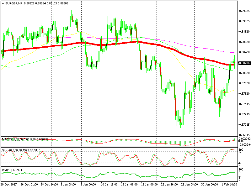 The price jumped higher in EUR/GBP but missed the SL target of our forex signal by just one pip. EUR/USD climbed this morning, but the 50 SMA on the H1 chart rejected the price. This helped the reverse in EUR/GBP as well.