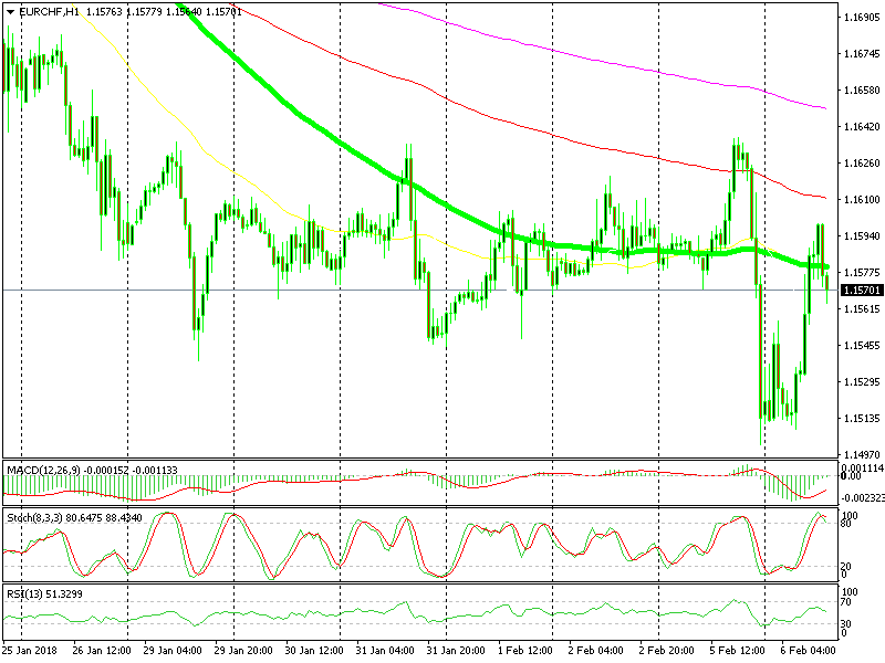 We opened a sell forex signal in EUR/CHF a while ago as this pair was retracing higher. The retrace was over on the H1 chart since the stochastic indicator reached overbought levels. Also, the 50 SMA (yellow) was providing resistance on the H4 chart when we were thinking of opening the signal, so we decided to pull the trigger.