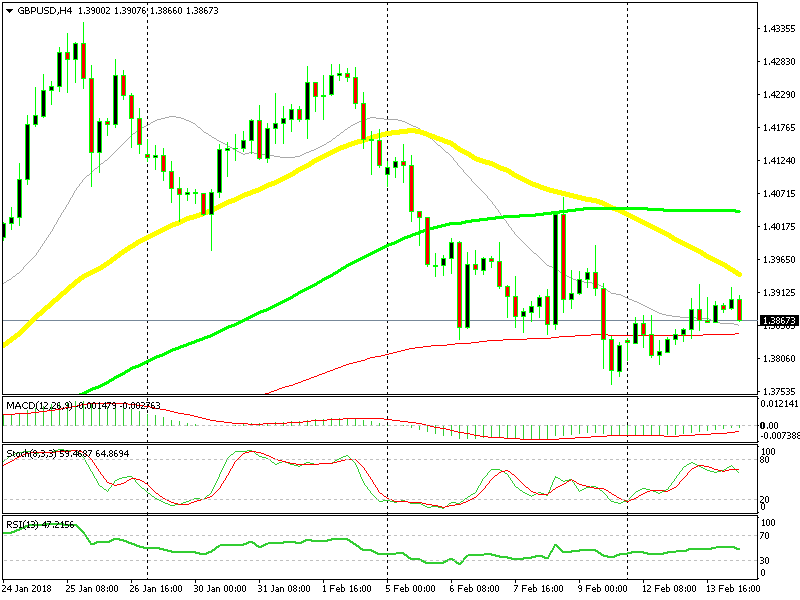 Around 10 pips lower, we find the 50 SMA (yellow). That is supposed to provide some support as well. If you switch to the H4 chart, you can see the 100 smooth moving average (red) at 1.3840. Although our signal would have hit the take profit target if we reach that moving average.