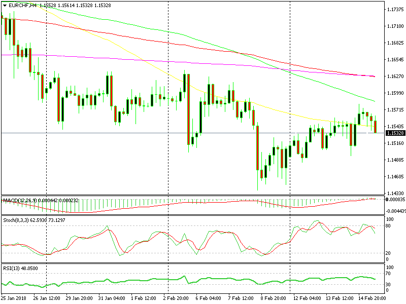 We opened a sell forex signal in EUR/CHF a while ago. We tried the same yesterday, but the horrible reverse in USD screwed the forex market and this pair popped higher. So, we decided to give it another try today and this trade looks pretty good now. The retrace up is over on the H4 chart since stochastic is overbought. We are just a few pips above the take profit target, so this was a good decision.