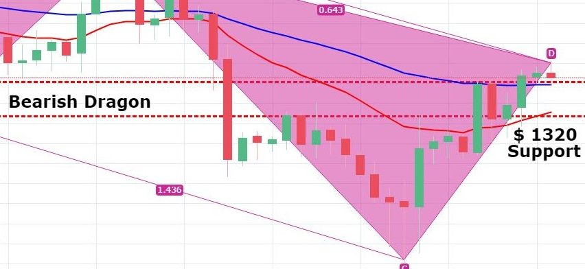 On the 4-Hour chart below, the yellow metal Gold has formed a bearish dragon pattern which completed it's C to D...