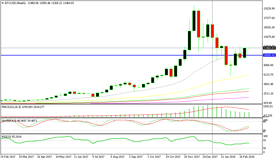 But, last week’s candlestick was pretty bullish. It opened below the $10,000 level and it closed right at the top, around $11,500. That invalidates the previous week’s bearish candlestick. In fact, this shifts the picture to bullish. Last week’s candlestick is a bullish engulfing one, which is a reversing sign after the previous bearish week, according to candlestick trading strategies.