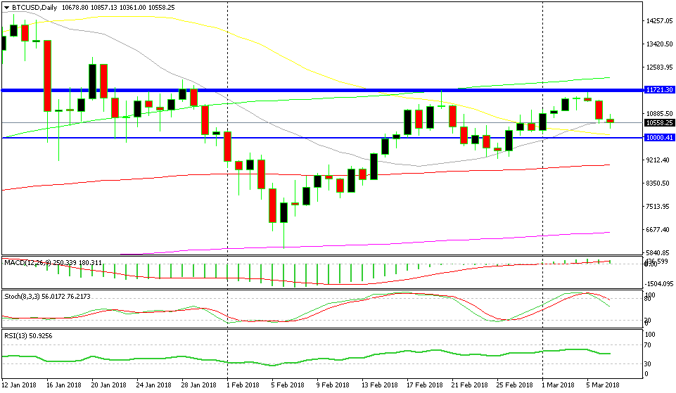 Bitcoin lost nearly $1,000 yesterday, so the daily candlestick looks pretty bearish. The whole chart setup looked bearish in fact. Stochastic was overbought and it turned down and the resistance at $11,600-700 rejected the price for the second time. It all started after Coinbase denied rumours to list Ripple coin (XRP) on the exchange.