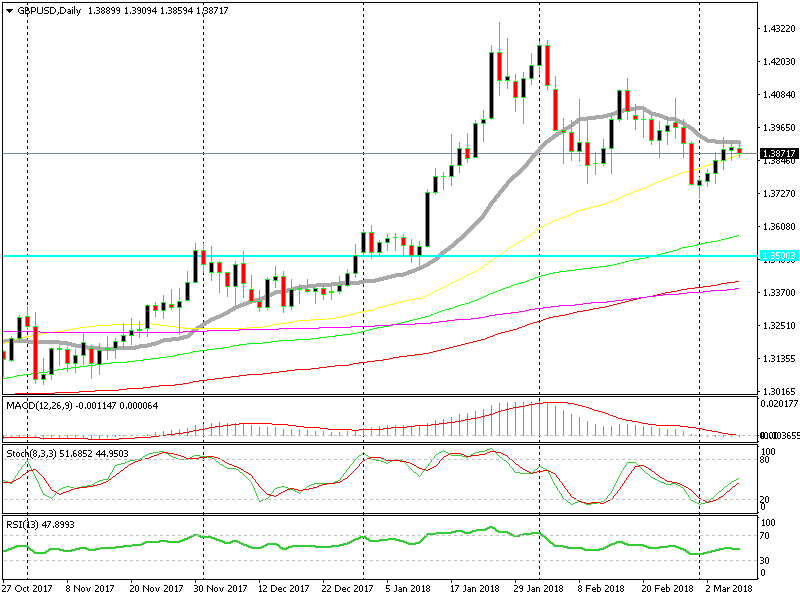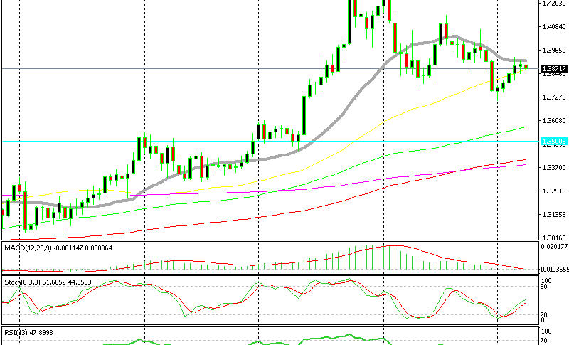 GBP/USD has turned back below 1.39 in the last few hours. The 20 SMA (grey) has provided resistance this week and yesterday’s candlestick closed as a doji. That is a reversing signal after the retrace higher and that formed right below the 20 SMA.