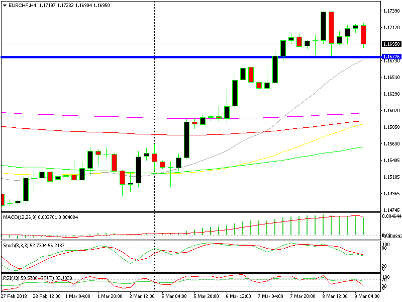 EUR/CHF has climbed pretty fast in the last several days. This sort of price action tells us that the buyers have returned strongly. So, the uptrend is back in place, therefore we are looking to buy this forex pair today.