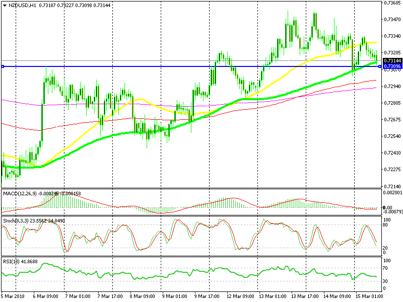 Yesterday we opened a forex signal with the NZD/USD. This pair was retracing lower in what seemed to be a 3-week uptrend. It reached the 50 SMA (yellow) on the H1 chart and was having trouble breaking below it. The price formed a few Dojis so we decided to go long.
