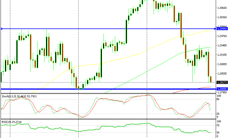 The support at 1.28 is still in place. Now the 100 SMA (red) has caught up with price and will likely strengthen the support area. Therefore, there is a trade opportunity here. I might open a short term buy signal near the red moving average with a tight stop below targeting a move of 30-40 pips.