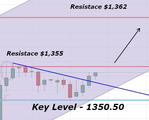 The idea is to stay bullish above $1,351 with a stop above $1,347 and to take profits near $1,357 and $1,364. Good luck!