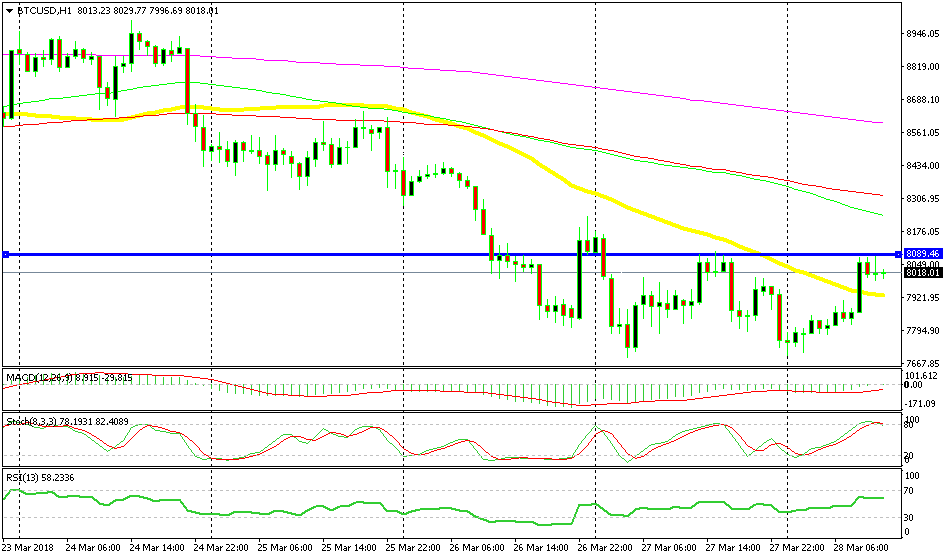 Today though, we are seeing an attempt by the buyers to form a bullish daily candlestick. Bitcoin started the day near the lows below $7,000 and it has been climbing up since then. It broke above the $8,000 level earlier today and it is trading near the highs now. So, the price action looks bullish for cryptos today, but we have to wait until the day ends because we have seen buyers attempt to reverse the market in the last few days, but at the end of the day, cryptos have ended up even more bearish.