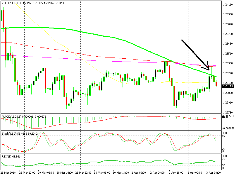 If you switch to the H4 chart, you can see that the 100 SMA is standing at 1.2330s. So, that moving average is strengthening the resistance on top. Now EUR/USD is really turning bearish. It looks like this pair might make the next leg of the downtrend today, breaking below the bottom of the range. Even if it doesn’t, our forex signal will reach take profit before reaching the end of the range.