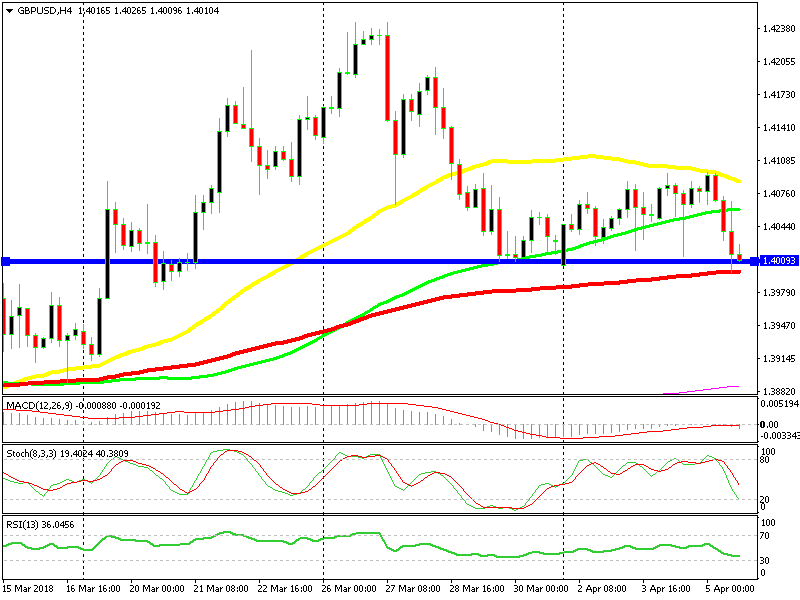 GBP/USD has been trading in a 100 pip range for about a week or so. The top of the range has been defined by the 50 SMA (yellow) which stands at around 1.41, while the bottom of the range comes at around 1.40.
