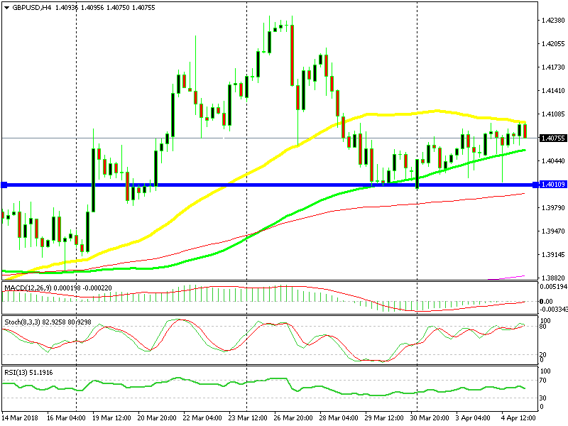 Yesterday we posted a forex update about GBP/USD. This forex pair has been trading inside a range for nearly a week. The range has been defined by the 100 SMA (green) at the bottom and the 50 SMA (yellow) at the top. It might look like a slight uptrend, but it’s more of a range as the candlestick wicks show.