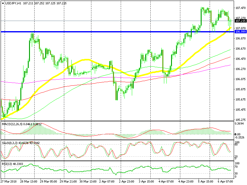 USD/JPY has been trading on an uptrend for two weeks since reversing from the lows at 104.50s. Last week was the first bullish leg. We saw a retrace lower by the end of last week, but the uptrend resumed again this week, so the trend is bullish. Today, USD/JPY has made a retracement lower again and at the moment, it looks like the retrace might be over. Stochastic is almost oversold and the 50 SMA is providing support. We might not go long since we have three open signals, but this looks like a good opportunity for buyers.