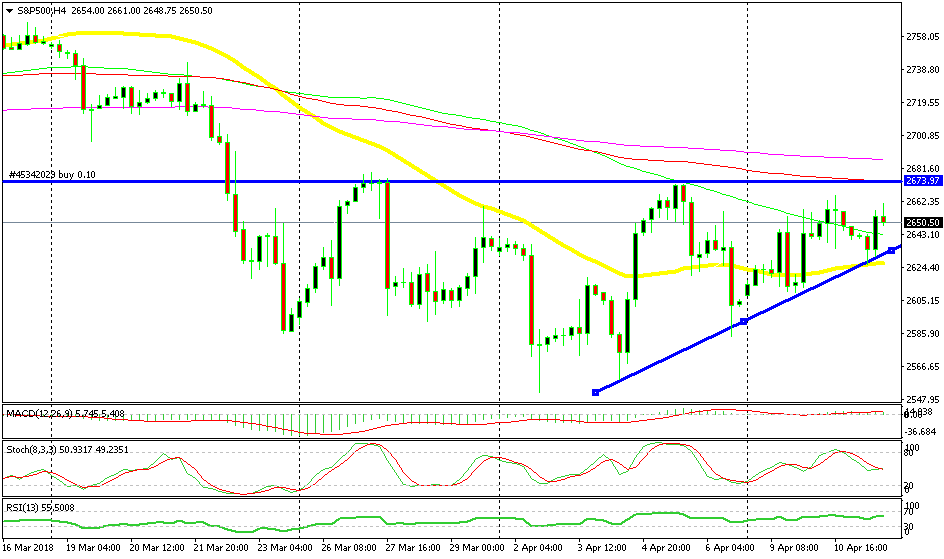 Although, it looks like S&P will enter the uptrend soon because the lows have been getting higher. The 50 SMA (yellow) provided support earlier today and the reverse higher is underway. This moving average has been resistance previously and it has turned into support now, which is another sign that the trend is changing. I’m long already on S&P so I’m not opening another trade, but you can if you want. Or, you can wait for the resistance line to be broken and go long then.