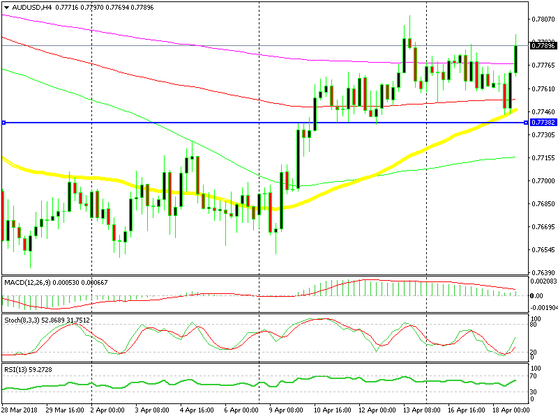 Yesterday, AUD/USD was retracing down and I decided to go long based on the hourly timeframe chart. The price was finding support on the 100 SMA on that timeframe and stochastic was oversold, which meant that the retrace down was complete.