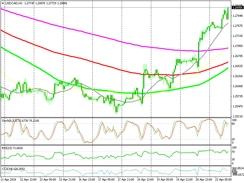 I was trying to open a buy forex signal in USD/CAD but I missed the opportunity just now. I was waiting for the price to reach the 20 SMA (grey) which provided support early this morning, but the price reversed about 10 pips above it, so we missed that opportunity. Although, I will still try to buy at that moving average if USD/CAD retraces back there again today since the market sentiment is really bullish for this pair.