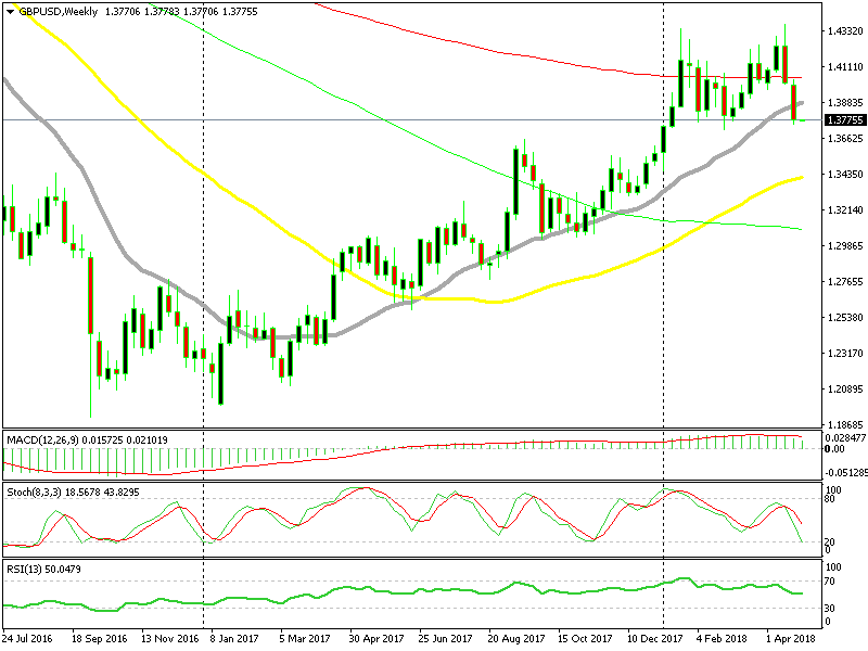 Once the trend is established, you can try a few forex trading strategies. The most obvious one is to get in and ride the entire trend. You enter when you think that a trend is beginning. In the GBP/USD weekly chart above, the uptrend starts when the 20 SMA (grey) and the 50 SMA (yellow) get broken. Normally, I would wait for a retrace to the two moving averages and after getting a confirmation that these two moving averages are holding, I would enter long on this pair.