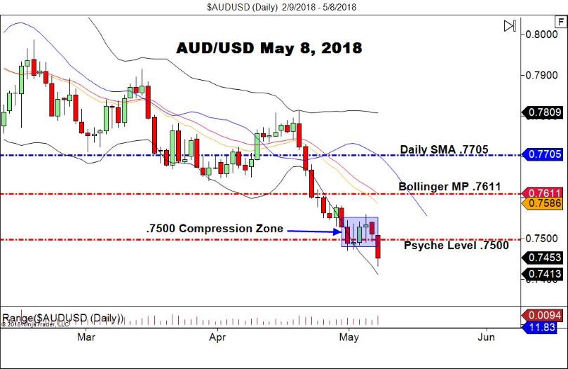 Is there anything that can stop the trend? Two things come to mind — a rally in gold and pressure on the USD. Perhaps President Trump’s announcement on the Iran nuclear deal at 2:00 PM EST will stimulate a run to safe-havens and give the Aussie a much-needed kick in the backside.