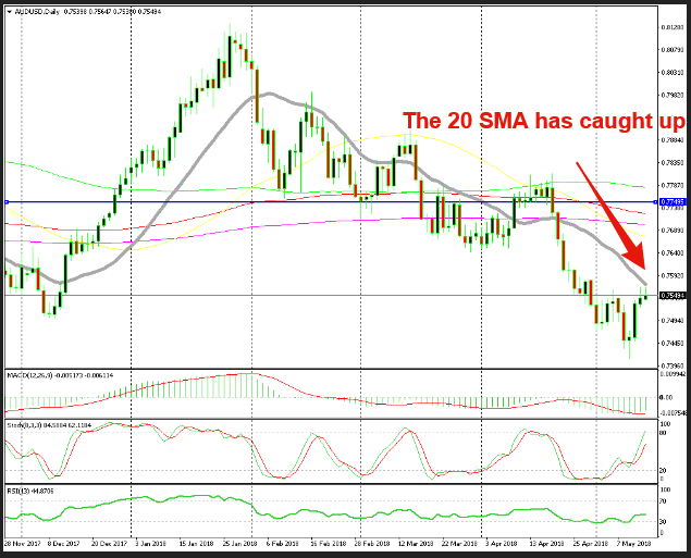 The retrace higher in AUD/USD seems almost complete. Stochastic is almost overbought and the 20 SMA (grey) has caught up with the price. Besides, the buyers don’t seem able to push higher today, so perhaps they are already exhausted. Therefore, this might be a good place to sell AUD/USD.