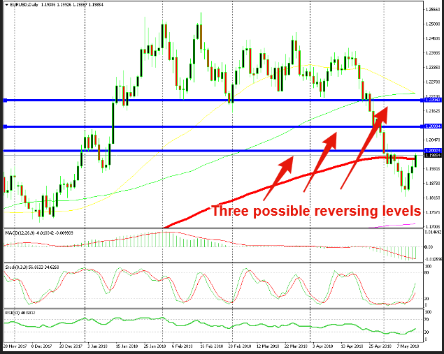There was a doji in EUR/USD, which we will look further below. There was also a doji in GBP/USD and AUD/USD. USD/CAD didn’t form a doji or other reversing candlesticks, but the situation has been a bit different on this pair since trump scrapped the Iran nuclear deal. Oil prices have been climbing higher after that and that has been the main reason for the reverse of this forex pair.
