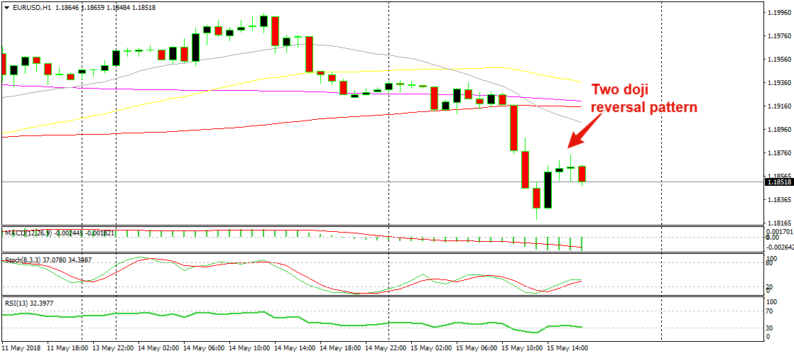 The last two candlesticks closed as dojis which are reversing signals after a pullback. This means that EUR/USD is about to reverse back down now after the pullback. Well, we just opened a sell forex signal in this pair and the price action looks promising. Let’s go for another ride now.