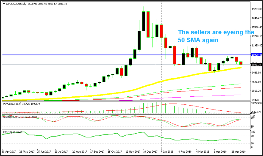 Bitcoin fell to $8,070 according to my platform, piercing the 50 SMA (yellow), which had provided support since Sunday. That didn’t look good for buyers like us. Remember that we have a long-term buy forex signal we opened on Monday.