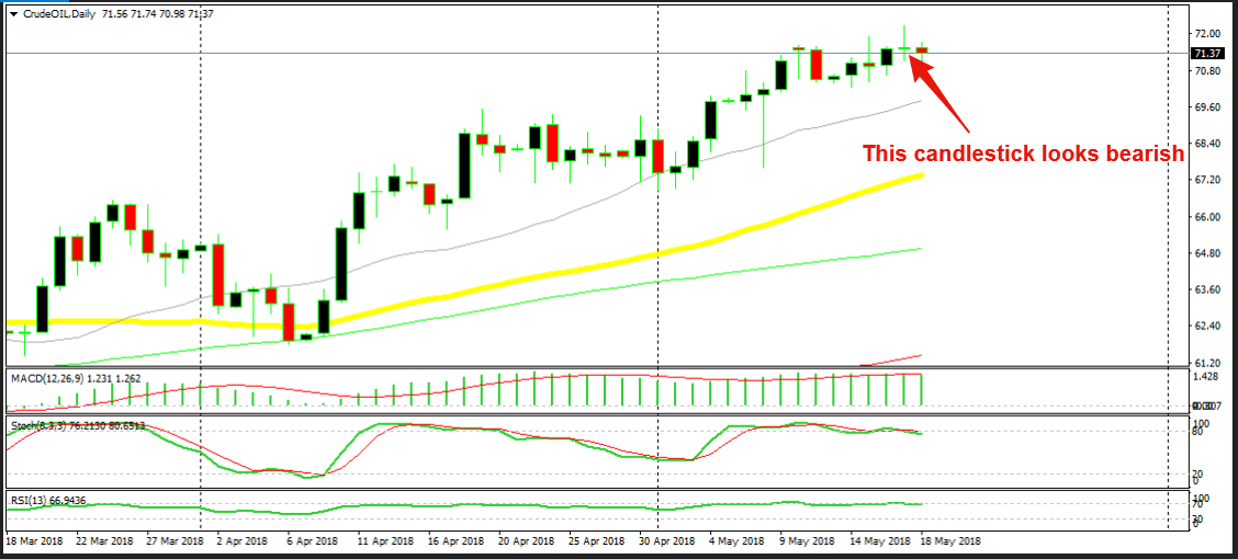Oil has been another factor in the reversal that we saw on Thursday afternoon. As you can see from the daily chart below, US Oil has been on a strong uptrend. Trump scrapped the Iran deal and the latest conflict on the Israel border has increased fears for a disruption in Oil output, hence the uptrend. Although, Oil prices started pulling back lower on Thursday, exactly when USD/CAD started reversing higher.