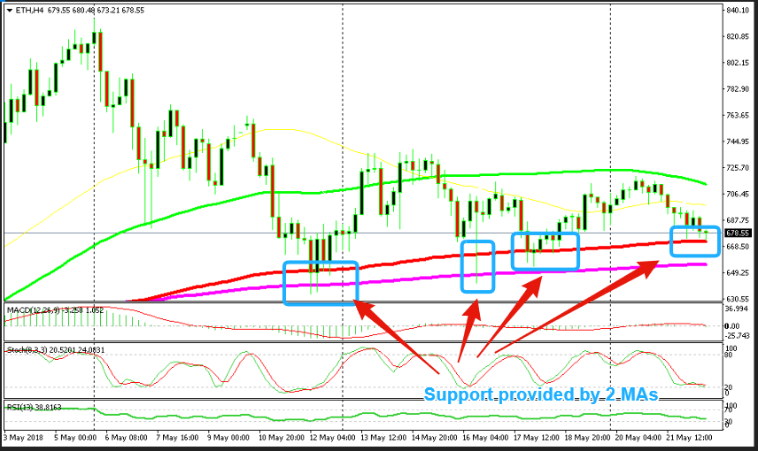 If you are an Ethereum trader, don’t be disheartened just yet. As you can see from the H4 chart below, there is hope at the two moving averages below. These moving averages are the 100 smooth MA (red) and 200 smooth MA (purple).