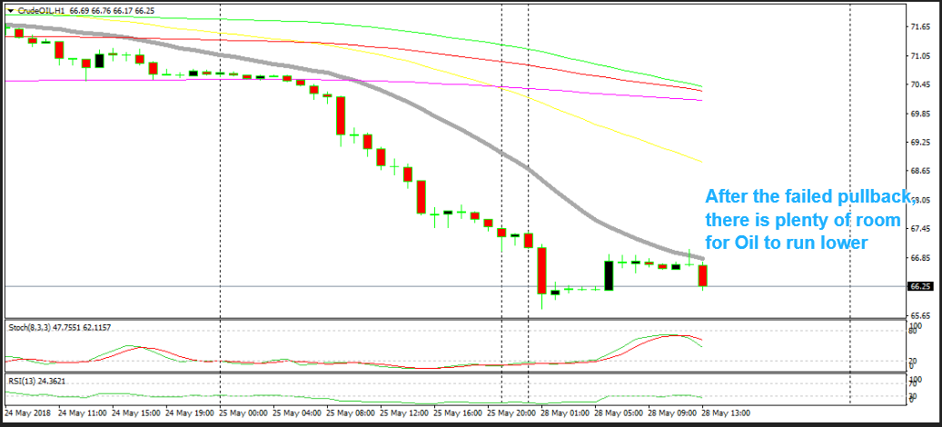 We opened a sell forex signal in WTI Crude Oil earlier today which just closed in profit. Although, I still see some more downside potential. The pullback up looked complete when we sold Oil since the stochastic indicator reached overbought levels. The 20 SMA was also providing resistance. The price has turned back down now and we just booked profit on that Oil signal.