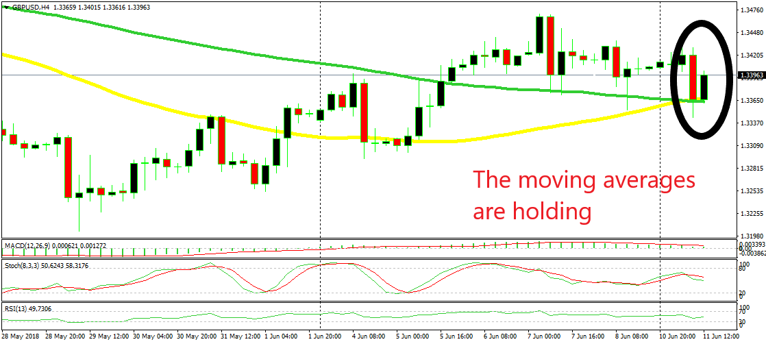 GBP/USD dived lower and lost nearly 100 pips from top to bottom. The price pierced two moving averages on the H4 chart during the decline, but now the price has pulled back up above them. It seems like these moving averages will survive the day today.