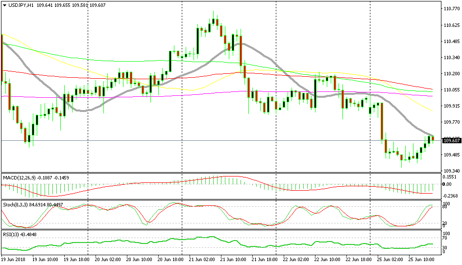 The trend in USD/JPY is bearish and it extended the bearish move during the night with the market sentiment remaining negative. Although, it has retraced up in the last few hours. The retrace seems complete since stochastic is now overbought. Besides that, the 20 SMA (grey) is providing resistance for this pair, so we decided to open a sell forex signal.