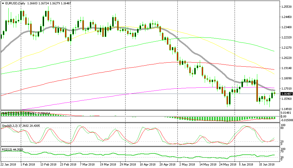 That was a bit of a relief for the Euro and EUR/USD jumped 30 pips higher. But, the 20 SMA (grey) is standing just above the highs on the daily chart and it is scaring the buyers off. This moving average has just caught up with the price and EUR/USD traders are aware of it.