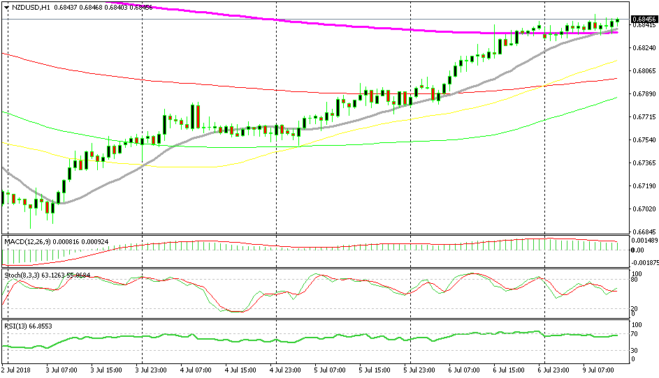 Commodity currencies have been on a strong bearish trend for several weeks. But, the trend changed last week, or at least a decent pullback is underway for risk currencies as they are making some decent gains against the US Dollar. NZD/USD has entered a bullish phase as a result and last week the uptrend was pretty smooth. The buyers didn’t find much resistance on the way up. The 20 SMA (grey) has been pushing the price higher, thus keeping the uptrend in place. Now the price has moved above the 200 SMA (purple) so the way is open for additional gains. The market sentiment is positive as well which is helping risk currencies.