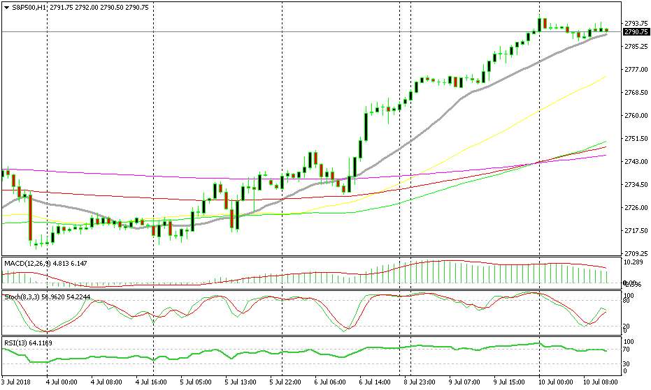 I was thinking about going long on S&P500 a while ago when the price was leaning against the 20 SMA (grey). The price bounced off that moving average, but it is now back there. This moving average has provided solid support during the uptrend this week and it is doing the same now. Although, the price might pull back a bit lower, so I am also looking at the 50 SMA (yellow) as a possible entry level.