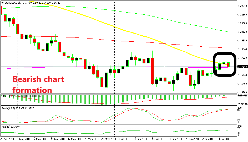Now, EUR/USD is around 30 pips higher, but I don’t see this as a bullish move. Looking at the daily chart below, you can see that yesterday the price formed an upside down hammer. That is a reversing signal after an uptrend.