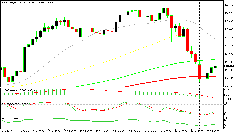 The 100 SMA (red) is another indicator which goes in favour of the buyers. It has provided support previously for USD/JPY and it is doing the same thing now. Although it was briefly broken, the price has moved back above it, so it still stands as support.