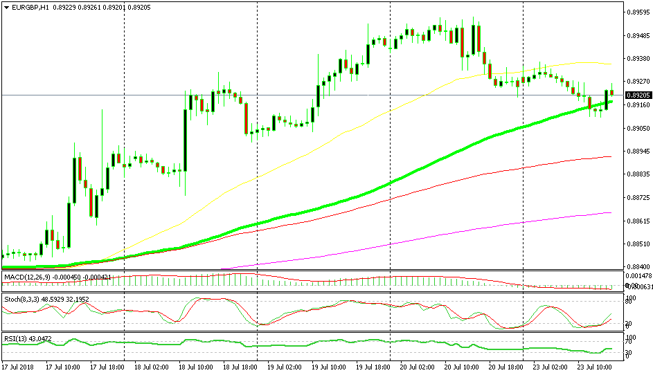 We bought EUR/GBP last week and still have that signal open. We went long in the 0.8940s region as this pair was retracing lower, but the retrace kept going. Now, this pair is severely oversold on the H1 and H4 charts and the retrace down seems exhausted. Stochastic is well oversold and turning up now, while the 100 SMA did a good job in providing support, despite being pierced for some time. The previous two doji candlesticks signalled a bullish reversal which seems to be underway already since the last two candlesticks are bullish. So, we are holding on to our signal in this pair.