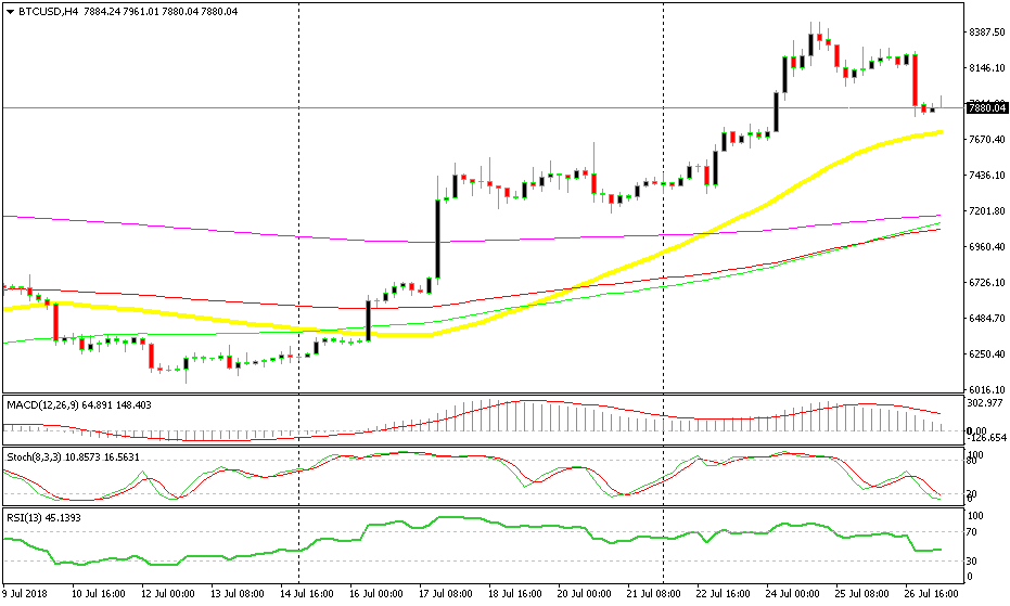 If you switch to the H4 chart, you can see that Bitcoin is oversold here and the 50 SMA (yellow) stands at $7,700. The area around this level was the high last week, which might turn into support now. So, I think I will wait until today closes to see if the sellers will have another try at the downside.