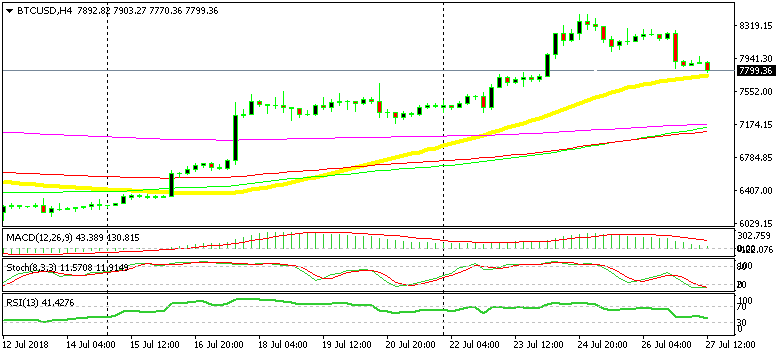 Bitcoin has retraced lower in the last three days after failing to break above the 50 SMA on the weekly chart. But, the bearish retrace seems to be almost over now that the stochastic indicator is well oversold on the H4 timeframe. As you can see from the chart above, the 50 SMA is providing support to Bitcoin, standing at $7,735 according to my broker. Besides the 50 SMA, this area was the high last week which means that it provided resistance. Previous resistance levels usually turn into support when they are broken, so this level will add additional strength to the 50 SMA. It is possible that we see a bullish reverse from here, although I would like to get another confirmation from a candlestick formation. If a see a doji or a pin on the H4 chart, then that will be the signal to go long.