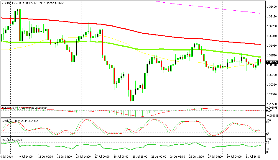 The Bank of England is widely expected to hike interest rates tomorrow, although they are expected to follow up with a dovish statement after that, considering that Brexit and the trde war are well underway. So, GBP sellers are waiting on the sidelines to make the move. The stochastic indicator is heading up on the H4 chart, but it is well overbought on the hourly timeframe chart. The 100 SMA (green) is also providing solid resistance here and the buyers are already reversing their trades as GBP/USD starts to slide lower.